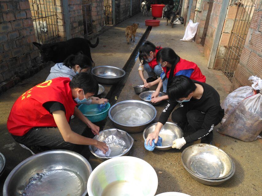志愿者们到达流浪狗之家,小狗们非常热情地冲向了同学们,摇尾巴,肢体接触等等,用他们特有的方式表达对志愿者们的欢迎。志愿者们在流浪狗之家负责人-杨阿姨的指导下,对狗狗们的住处进行了清扫,并认真清洗狗狗们的饭碗,在清洁过程中,时不时可以看到狗狗们与同学们玩耍的身影。