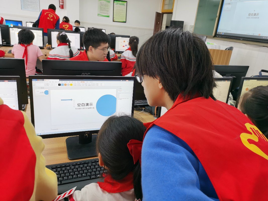 主讲人唐露为小朋友们分步讲解“PPT简易动画”制作方法,八位志愿者则协助小朋友们完成动画制作。小朋友们对动画制作展现出浓厚的兴趣。在志愿者帮助下,小朋友们很快学会了简易动画制作方法,并热情地向志愿者展示自己的作品。(唐露 文,黄锎靓 审)