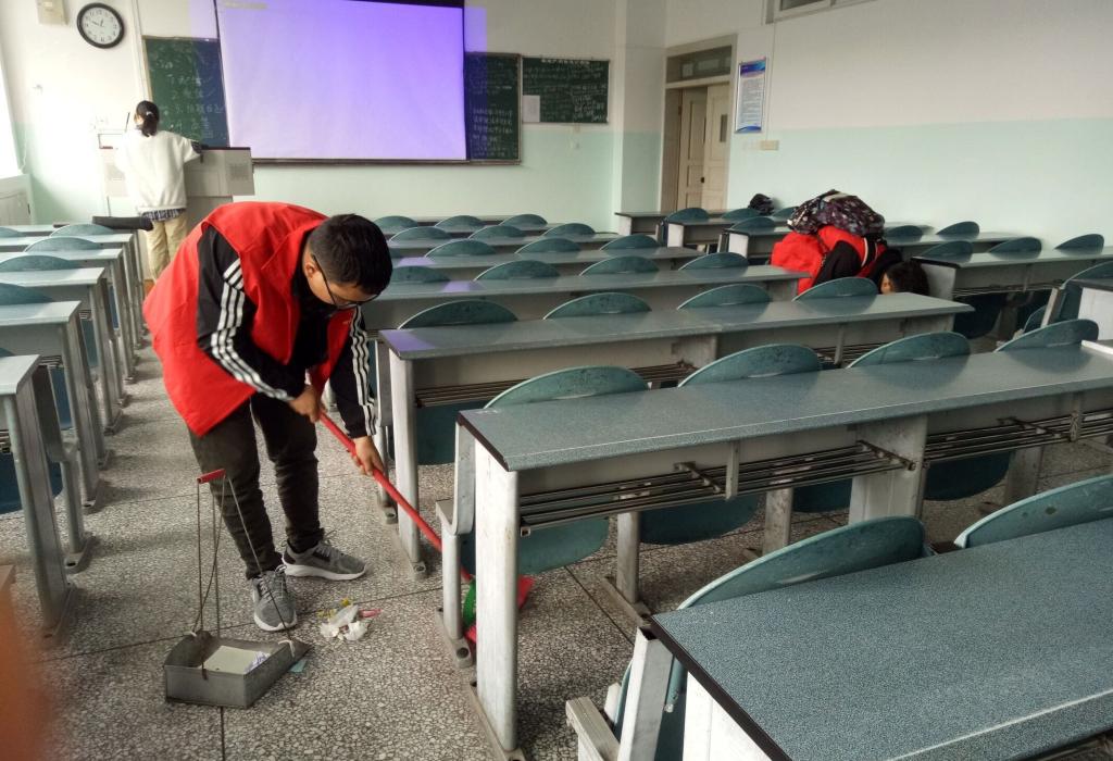 志愿者们提前做好分工,以小组的形式对黑板、抽屉、桌面、楼道等每一个卫生死角进行清理。他们手拿塑料袋,一丝不苟地清洁每一间教室,检查无人教室的关灯情况,擦拭黑板上的无效信息,收拾教室抽屉垃圾等。从走廊到教室,志愿者们秉持认真的态度,以高质量的态度积极地完成清洁任务,充分彰显青年志愿者先进模范作用。维护教室干净整洁面貌,更竭力营造美丽环保的校园环境。(文:冯千禧,姚智宇;审:文毅)