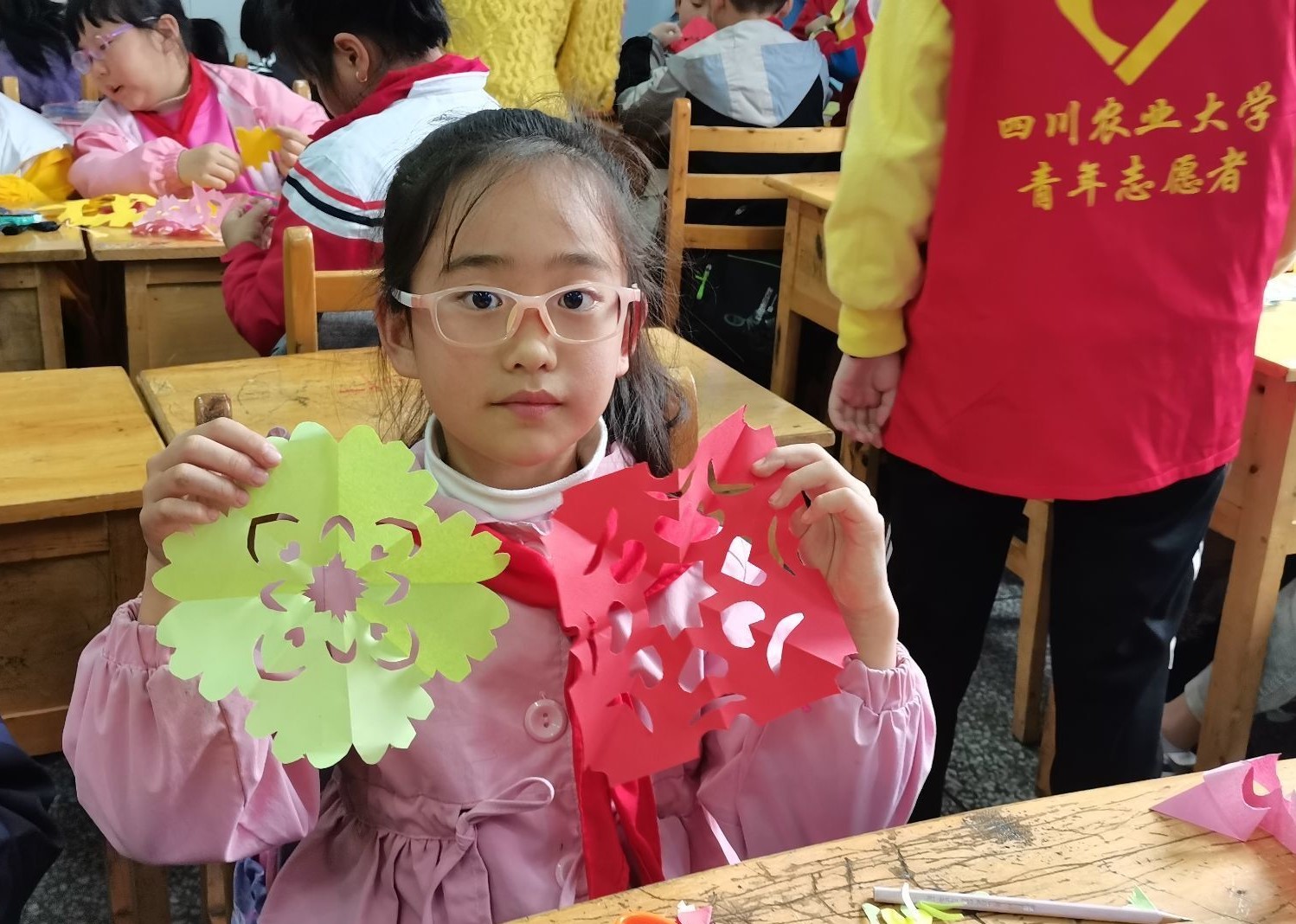 课程开始,小朋友们便迫不急待想尝试剪纸,志愿者维持课堂秩序。小朋友们耐心听取老师教授方法,细心学习技巧,手中剪纸图案已现雏形。小朋友纷纷表示:“实在是好玩!”兴高采烈地交流彼此的剪纸形状。在课堂的最后,小朋友们展示了各自的剪纸,与志愿者合影留念。