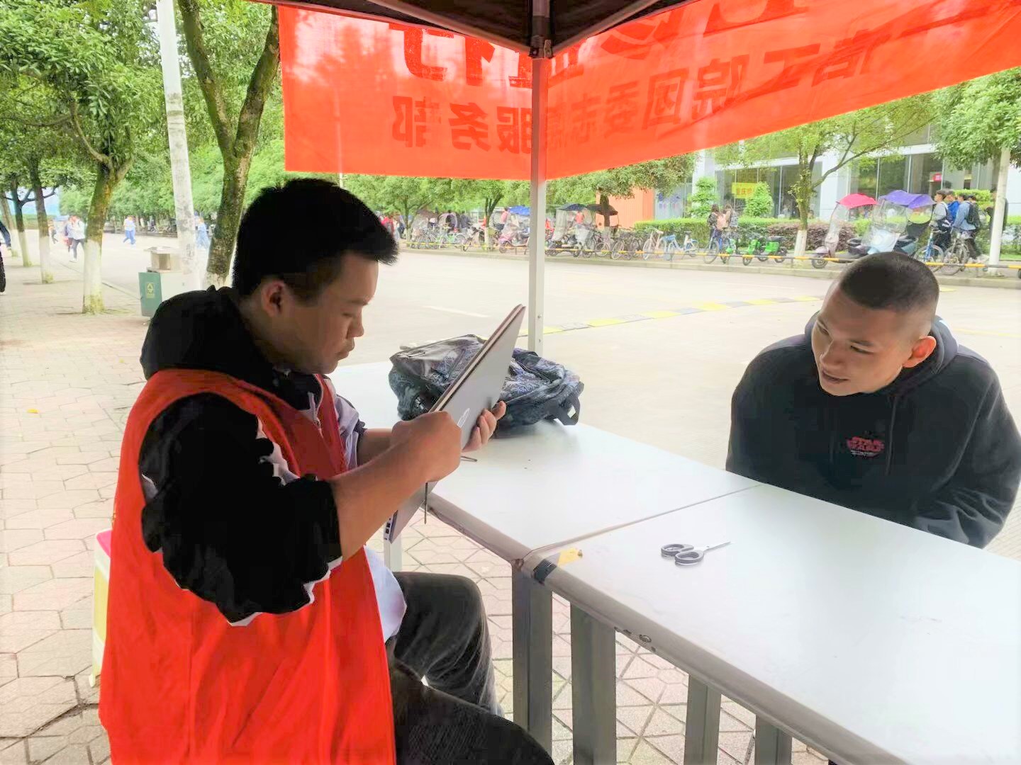 上午11时,志愿者们提前在二区主干道进行活动相关准备工作,搭帐篷、摆桌子和凳子、挂好活动旗帜,等待同学们的到来。活动开展期间,志愿者们热情地接待前来咨询的同学,积极地帮助同学们解决包括系统优化、安装软件、清灰杀毒等一系列电脑问题。志愿者们的工作受到在场同学的一致好评。