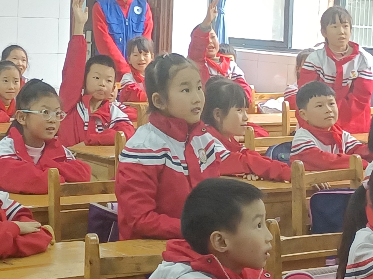 小朋友们认真聆听,积极回应问题,现场气氛活跃,其中一位小朋友说:“哥哥姐姐们讲得很好,我以后也知道要节约水、电,也知道了一棵树可以带来很多益处,懂得了勤俭节约的意义,感觉今天收获很大。”