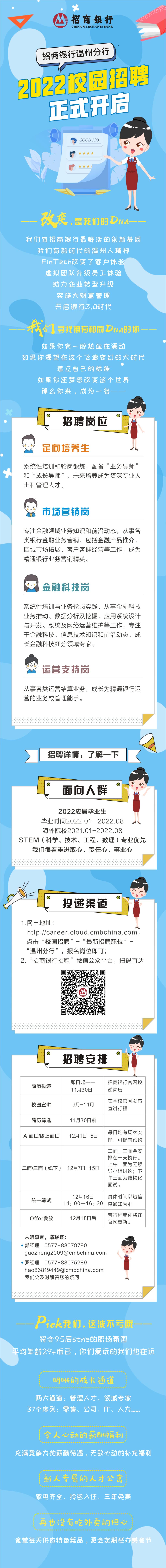 招商银行是全球500强企业上市公司,市值破万亿。温州分行校招优政:完备培养体系+双通道发展模式;所有岗位年薪10万起+福利保障;文体活动丰富,各类俱乐部,每月读书心得100元,跑步100元,总行中稿1000元。三年员工宿舍(拎包入住公寓)+购房安心计划。 欢迎看图扫码网申,线上面试已启动。