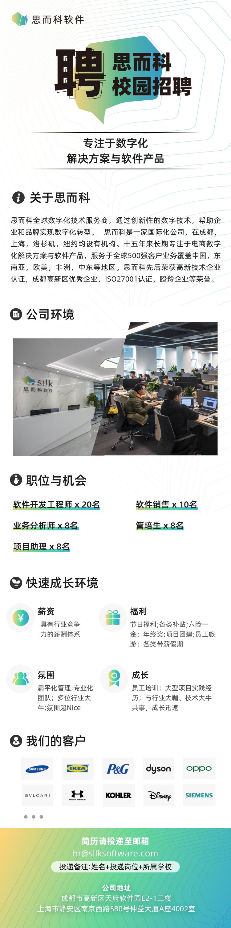 官网:http://www.silksoftware.cn/公司地址:成都市高新区天府软件园E2-1三楼上海市静安区南京西路580号仲益大厦A座40楼02室简历请投递至邮箱:hr@silksoftware.com投递备注:姓名+投递岗位+所属学校
