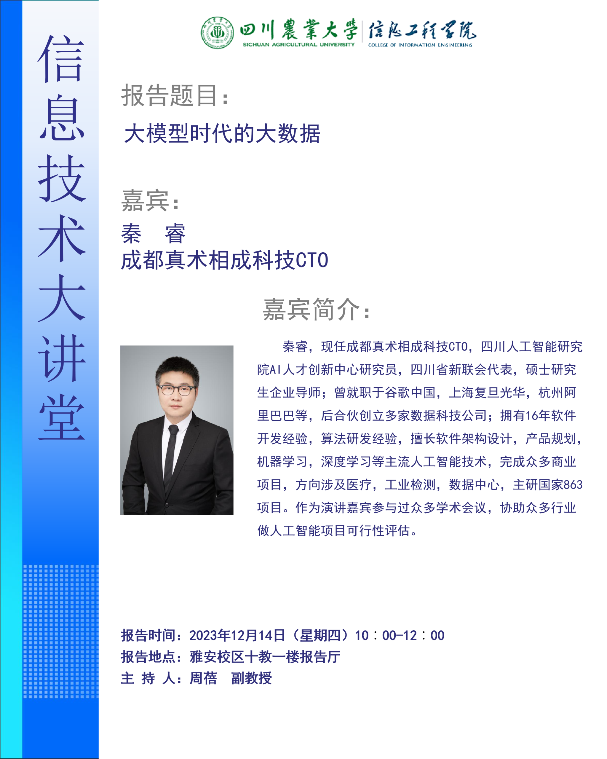12月14日上午10点,信息工程学院邀请成都真术相成科技CTO秦睿做客学院《信息技术大讲堂》,在十教一楼报告厅开展了题为《大模型时代的大数据》的专题讲座,电子信息全体研究生及学院本科生超200余名同学参加。讲座由周蓓主持。